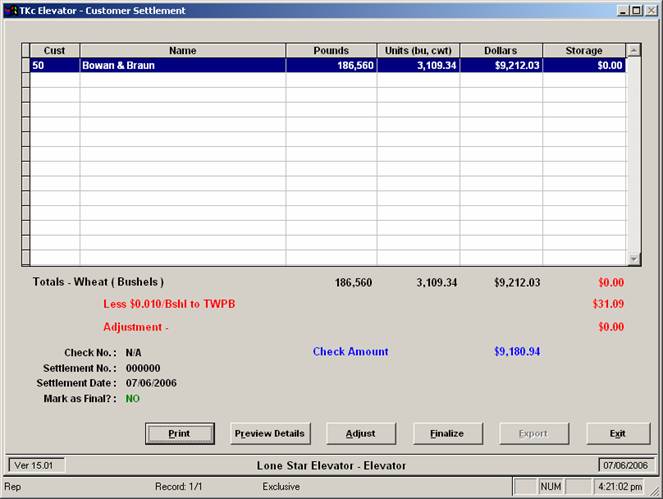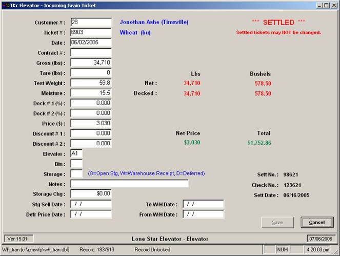 Customer information, including customer names, addresses, farm information and contracts, are maintained here. Customer settlements as well as numerous other reports are also produced by this component. If you need to know how much grain was received during the last week, you can obtain that information with a few keystrokes.
