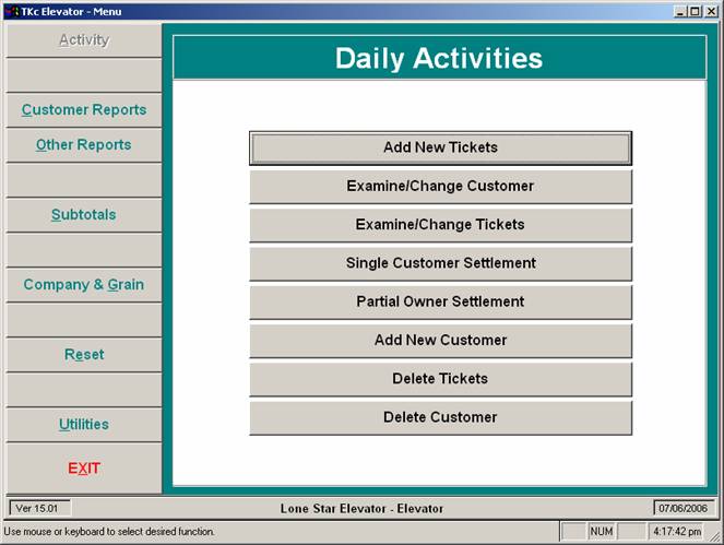 The first module is called ELEVATOR and is where incoming grain is processed. This is the area where you enter customer information and incoming scale tickets, produce settlements, print incoming grain reports, sell stored grain, and all of the other functions associated with incoming grain.