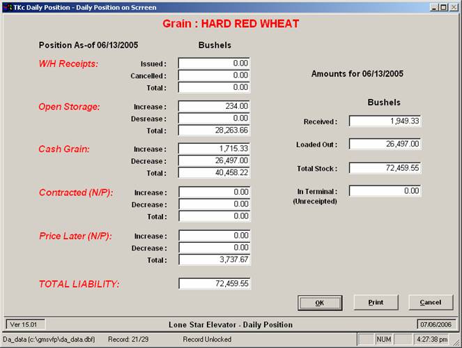 The final component of the system is known as DAILY and is where you keep up with the position of each of your grains. Information may be automatically transferred from the incoming (ELEVATOR) and outgoing (SHIPPER) tickets so that you do not need to re-enter this information a second time.