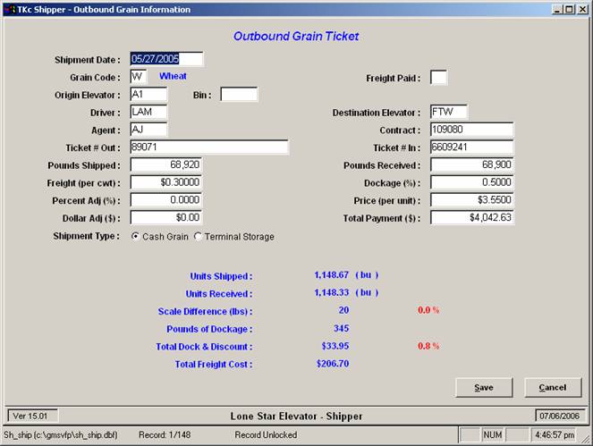 SHIPPER is the second major area of the system and is used to enter and maintain information about grain that is leaving your facility. It can provide you with information about grain destinations, shipping agents, freight costs associated with the transport, and many other types of data.