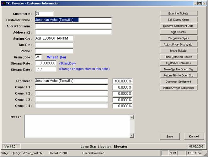 Customer information, including customer names, addresses, farm information and contracts, are maintained here. Customer settlements as well as numerous other reports are also produced by this component. If you need to know how much grain was received during the last week, you can obtain that information with a few keystrokes.