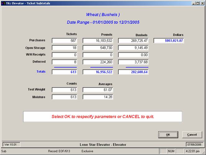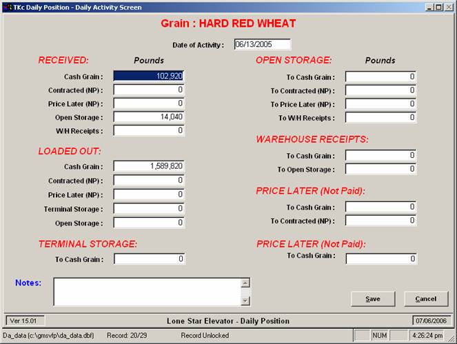 The final component of the system is known as DAILY and is where you keep up with the position of each of your grains. Information may be automatically transferred from the incoming (ELEVATOR) and outgoing (SHIPPER) tickets so that you do not need to re-enter this information a second time.